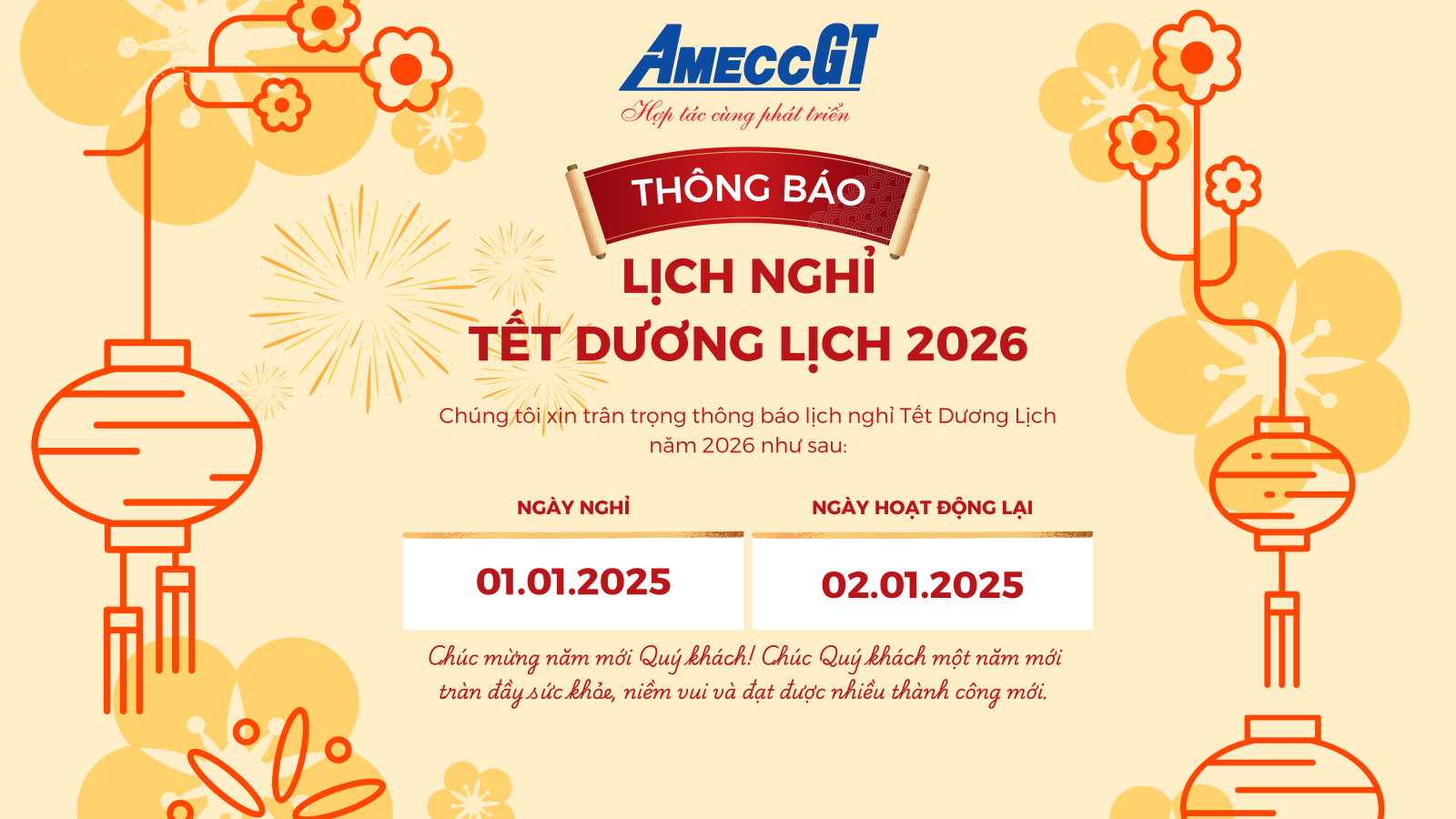 Nhằm tạo điều kiện cho cán bộ công nhân viên nghỉ ngơi, tái tạo năng lượng cho một năm mới hiệu quả và bứt phá hơn, Công ty Cổ phần AMECC GT trân trọng thông báo lịch nghỉ Tết Dương Lịch 2026 như sau: